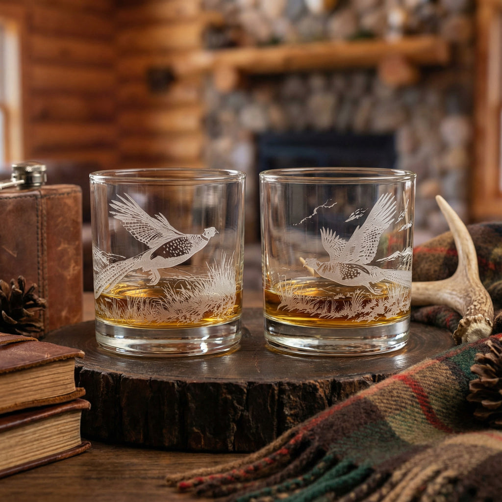 Sand-Carved Etched Pheasants Design Whiskey Glasses