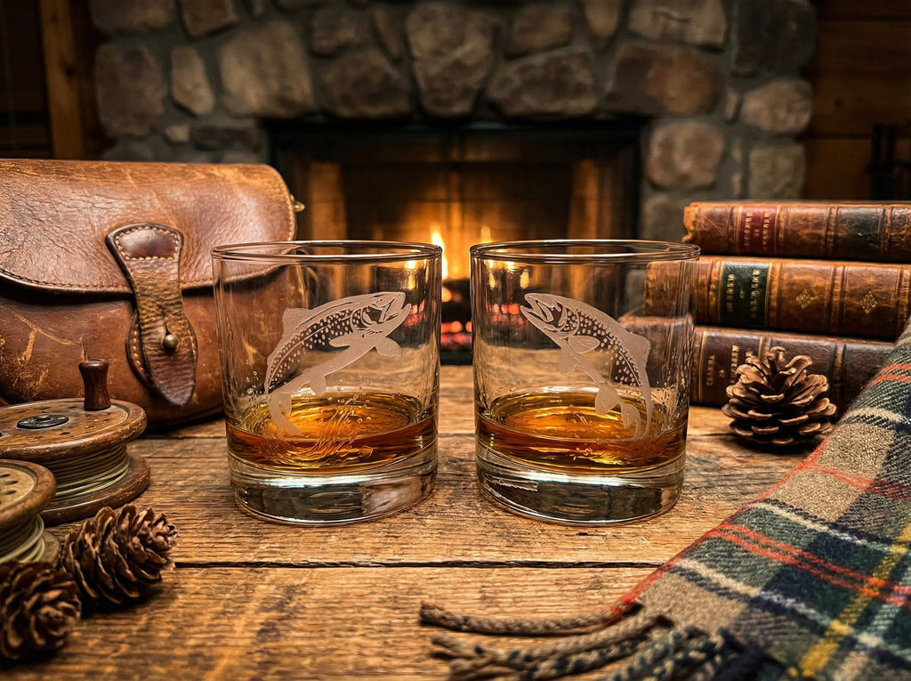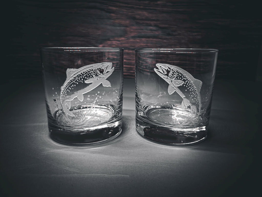 Sand-Carved Etched Trout Fish Design Whiskey Glasses