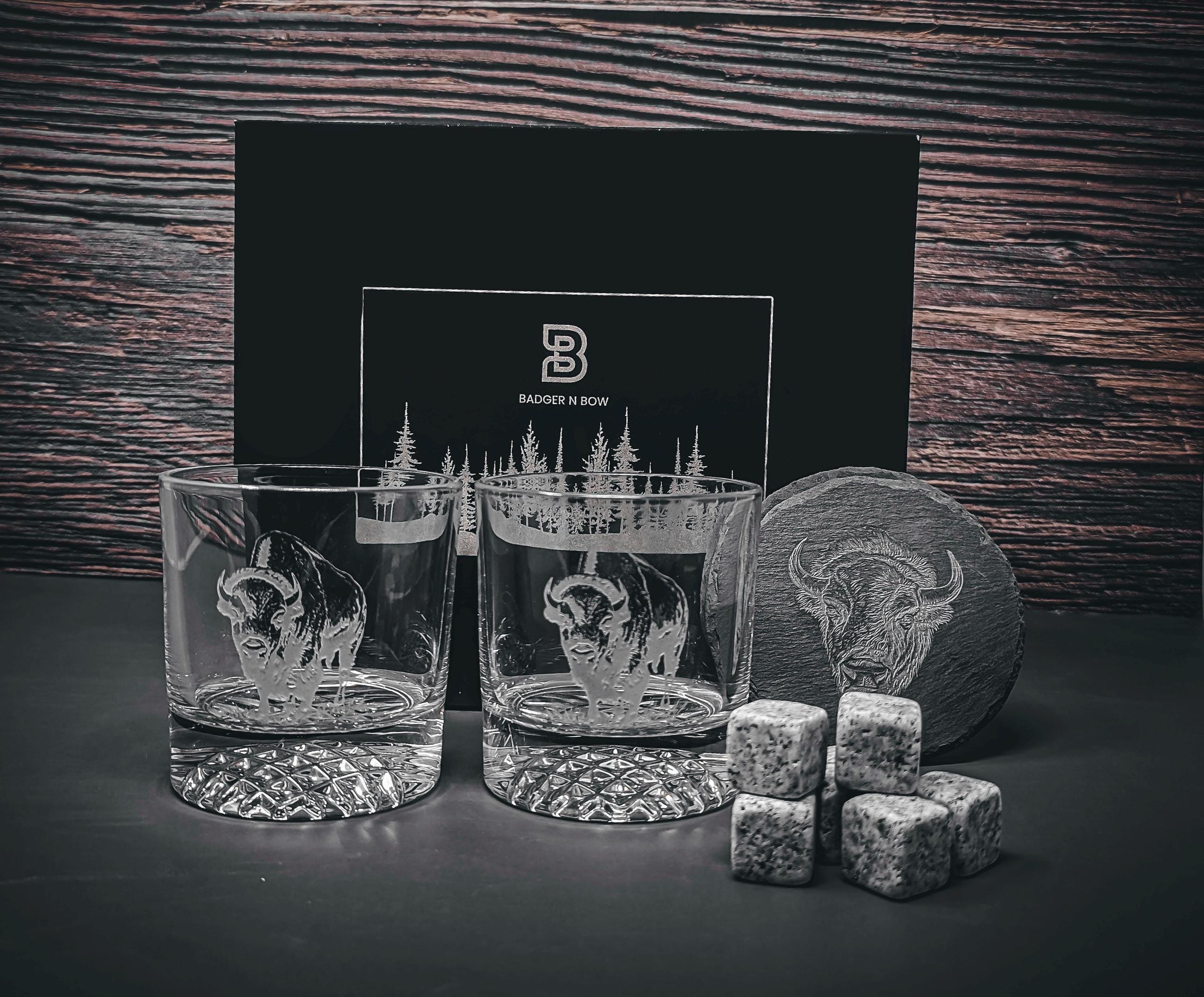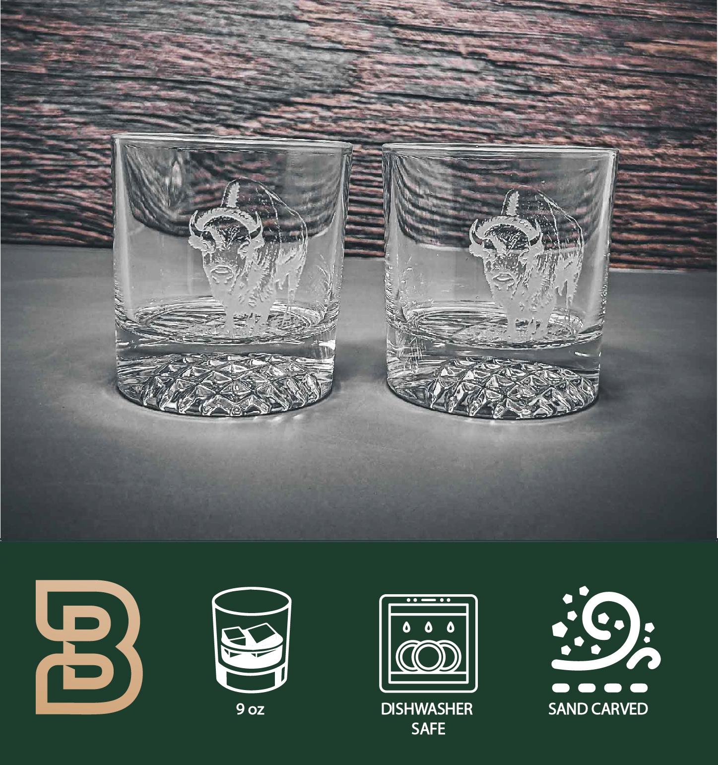 Sand-Carved Etched Bison Design Whiskey Glasses Gift Set