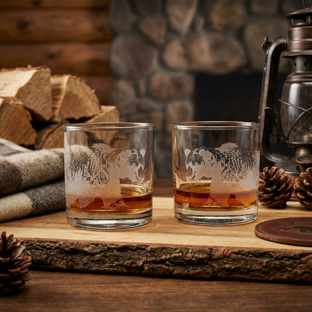 Sand-Carved Etched Bear Design Whiskey Glasses