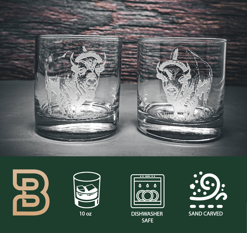 Add a touch of wilderness to your whiskey collection with our sand-carved etched Bison design whiskey glasses. Order now and enjoy the perfect blend of nature and sophistication in every sip.