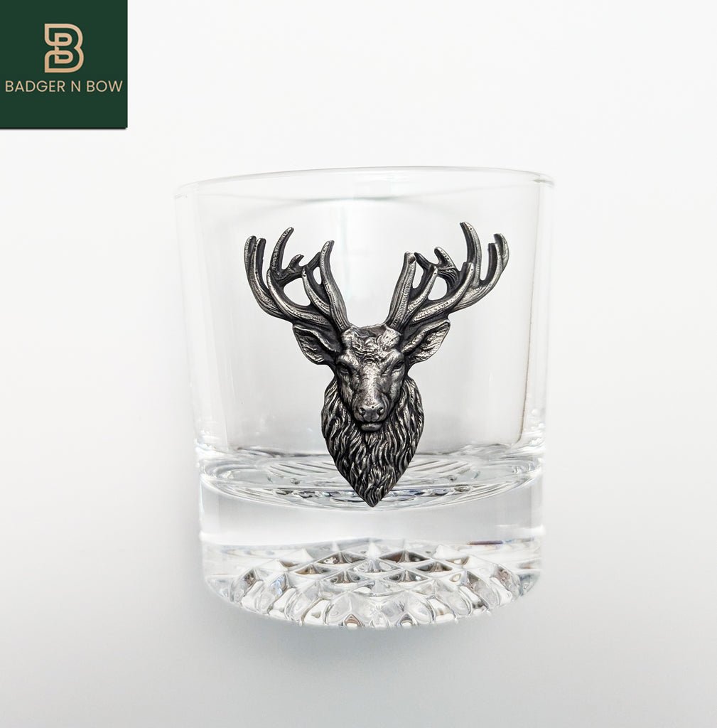 This stunning whiskey glass with a Elk Head design is a handcrafted piece that combines rustic charm with timeless craftsmanship. Made from high-quality glass and featuring a detailed locally made aged pewter stag head embellishment, this tumbler is both elegant and durable. Its size is perfect for enjoying a generous measure of your favorite whisky or whiskey neat, making it a perfect addition to any home bar or collection.
